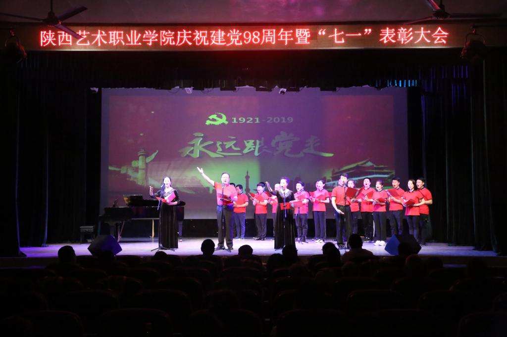 2019年7月1日,陕西艺术职业学院庆祝中国共产党成立98周年暨“七一”表彰大会在老校区小剧场隆重举行。学院党委书记王延奇,党委副书记、院长强陆平,党委副书记、纪委书记杨福旺,党委副书记、副院长肖幸海,党委委员、副院长罗斌、佘占宏、任玉银,党委委员、院长助理邵鸣,党委委员、干部人事处处长刘艳萍与全体党员等200余人参加大会。大会由杨福旺主持。