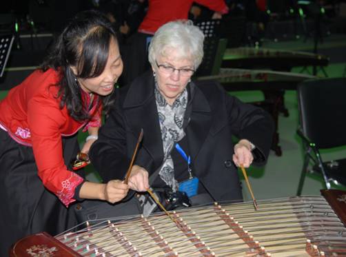观摩结束后,访华团一行共同观看欣赏了我院安排的大型文艺演出和民乐乐团演奏会。刘胜辉院长在欢迎仪式致辞中简要介绍了陕西艺术职业学院的办学情况、学生规模及专业设置,并向访华团代表赠送了由该院美术教师创作的秦腔脸谱绘画艺术作品,希望有更多的外国朋友知道秦腔,了解中国文化,喜欢中国艺术。