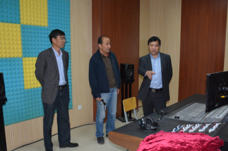 刘胜辉(左一)、杨福旺(右一)随张建平(右二)参观该院录音演播室