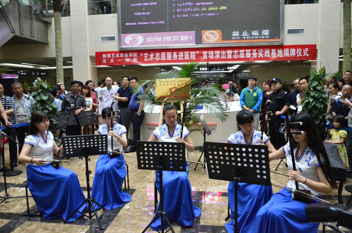 2015年6月30日,我院与交大第一附属医院合作举办“艺术志愿服务进医院活动”首场演出暨“志愿服务实践基地”揭牌仪式。我院院长助理、学生处处长邵鸣出席了仪式,我院团委工作人员、器乐系王育等部分师生参加了活动。