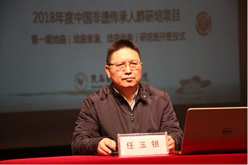 11月14日,由文化和旅游部、教育部、人力资源社会保障部共同实施,陕西省文化和旅游厅与陕西艺术职业学院联合举办的2018年度中国非遗传承人群研培项目首期戏曲艺术研培班在陕西艺术职业学院正式开班。陕西艺术职业学院党委委员、副院长任玉银,陕西省文化和旅游厅非遗处副处长周颖、陕西艺术职业学院戏曲系主任李旭阳、商洛市商州区文化馆馆长郝忠锋以及来自商洛市山花艺术团、白水县剧团、凤翔大塬曲子团的60位戏曲艺术传承人参加了开班仪式。开班仪式由李旭阳主持。