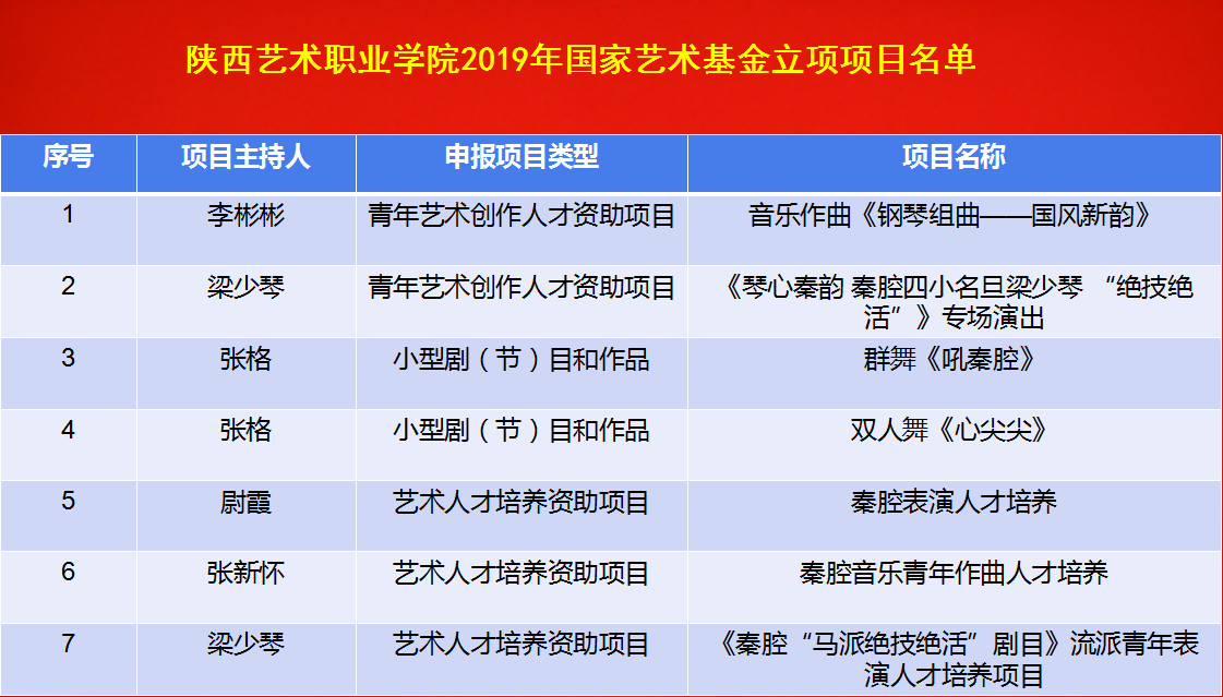 近日,经国家艺术基金专家评审,并报国家艺术基金理事会审定,2019年国家艺术基金资助项目立项名单予以公示,我院获准7项2019年国家艺术基金项目,立项数量居陕西之首。