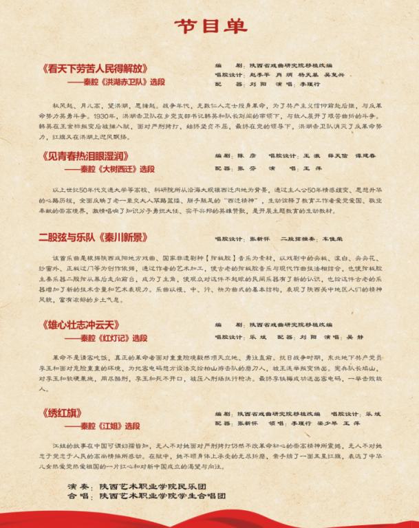 本次演唱会由陕西艺术职业学院戏曲系师生,学院合唱团和民族管弦乐团担纲演出,通过师生同台表演,追忆难忘革命岁月,唱响新时代奋斗精神,为纪念党的十一届三中全会胜利召开暨改革开放40周年献礼。