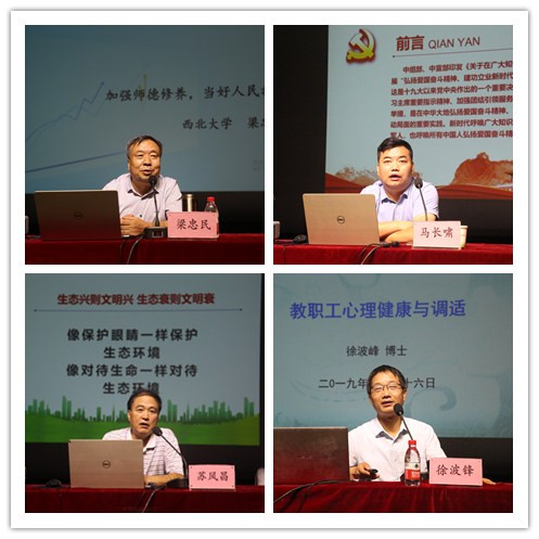 本次培训的课程设置包括专业课与公需课各两场。由西安体育学院徐波锋教授和西北大学梁忠民教授带来的《高校教师心理健康及压力调适》《加强师德修养,当好人民教师》的两场专题培训现场气氛活跃,授课语言幽默诙谐,获得在场学员一致好评。西安工程大学马长啸副教授与西安市委党校苏风昌教授所作《弘扬爱国奋斗精神、建功立业新时代》《生态文明建设与环境保护》两场公需课培训,使学员们进一步提升了自身政治素质与业务素质,对于生态文明的相关文化知识也有了更高层次的领悟。