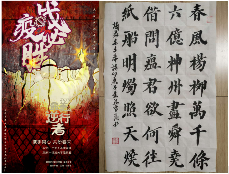 ——拿起画笔,为战“疫”助威。疫情发生后,学院及时倡议师生发挥艺术专业特长,吹响战“疫”嘹亮号角。该支部党员积极响应,发挥专业特长,用海报、书法、绘画、篆刻、雕塑、动漫等多种艺术形式,表达对一线战“疫”英雄和白衣天使们的感激与深情祝福,以及对早日战胜疫情的期待,并被省教育厅官网、官微刊登,鼓励更多人同心战“疫”。