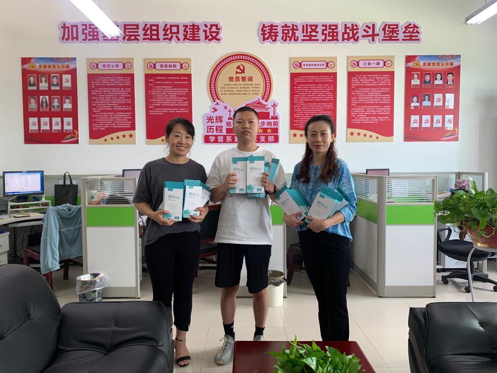 学管系直属党支部书记梁晓婷、副主任刘慧敏感谢毛潇帆同学的物资捐赠,并表示在新学期开学、师生返岗返校的关键时刻,捐赠的不仅是一份防疫物资,更是一份温暖,系部将统筹做好疫情防控与教育教学工作,让同学们在新学期有新成长新收获。