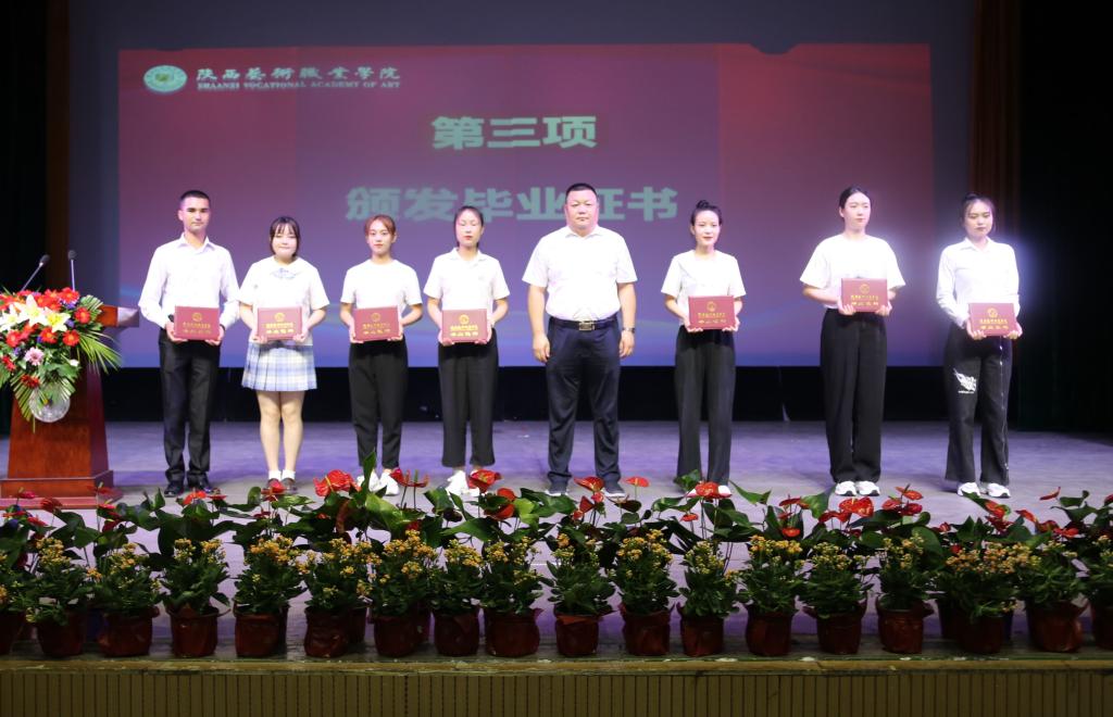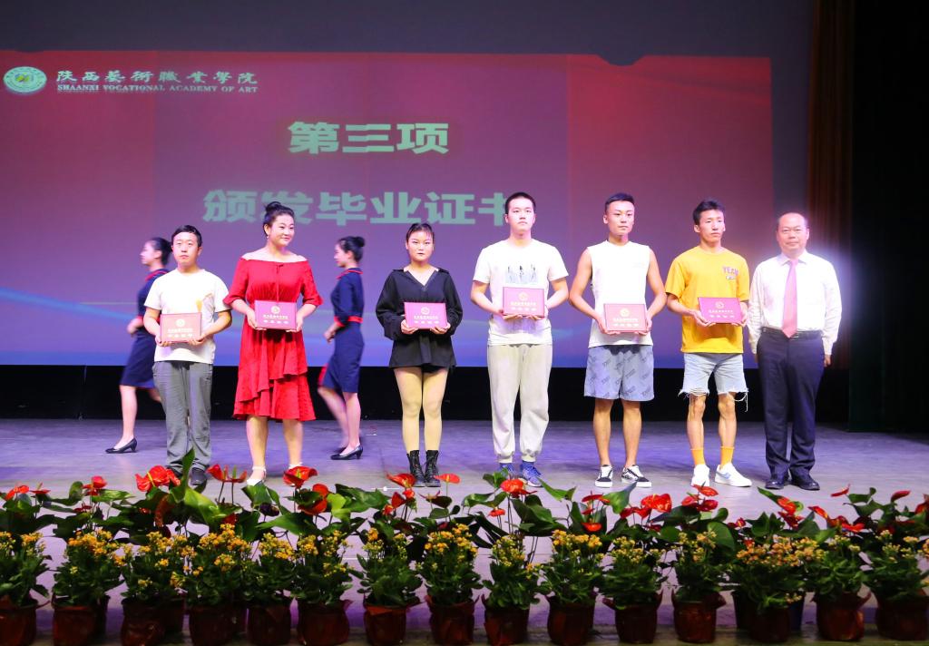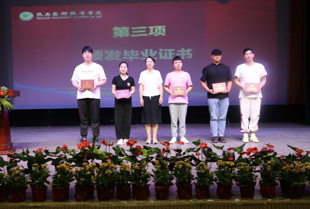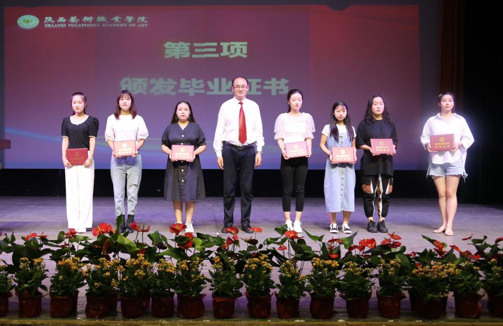 任玉银宣读了《陕西艺术职业学院关于 2020年戚顺等873名高职学生准予毕业的决定》《陕西艺术职业学院关于 2020年党汉等247名中职学生准予毕业的决定》。全体院领导为优秀毕业生代表颁发了毕业证。