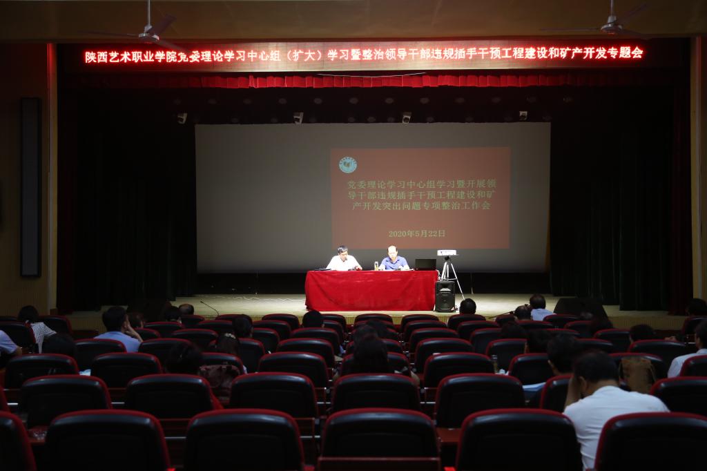 5月22日上午,院党委书记刘正利在文艺南路老校区小剧场主持召开党委理论学习中心组(扩大)学习暨开展领导干部违规插手干预工程建设和矿产开发突出问题专项整治工作会,传达学习《中国共产党员廉洁自律准则》《党委(党组)落实全面从严治党主体责任规定》《中共陕西艺术职业学院委员会关于开展领导干部违规插手干预工程建设和矿产开发突出问题专项整治工作方案》等相关文件精神和习近平总书记关于坚持和完善人民代表大会制度的重要思想。学院全体党委委员、纪委委员及副处级以上干部等参会。
