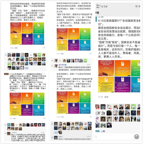 【影视系】影视系各班在班级微信群转发学习国家安全法律法规与《总体国家安全观公益宣传片》,并展开积极讨论。“作为当代青年我们应该记住国家安全日,践行社会主义国家安全观。永远牢记国富民则富,国强民则强,国家安全则人民安全,居安思危,方能立于不败地位,国家安全教育日是国家迈出的一大步,而我们需要做的,就是紧跟国家的步伐,迈出属于我们每个人的一小步。”该系学生吴环博表示。