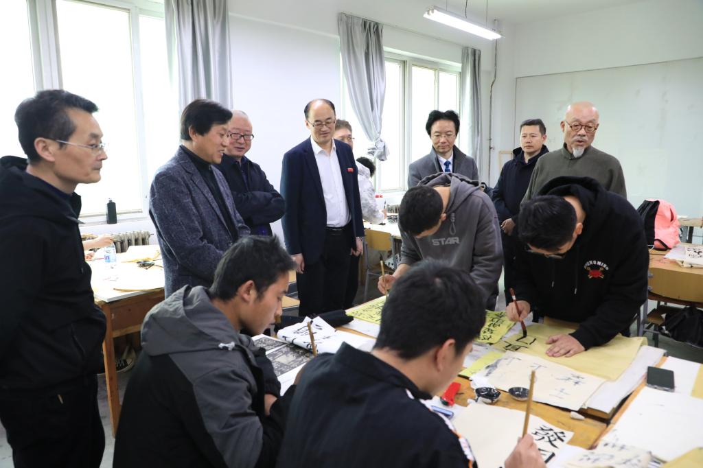 仪式前,陈建贡、郑墨泉一行还走进学院美术系课堂了解书法教学情况,并参观了学院非遗传习研究中心与陕西省视觉重构工程中心。
