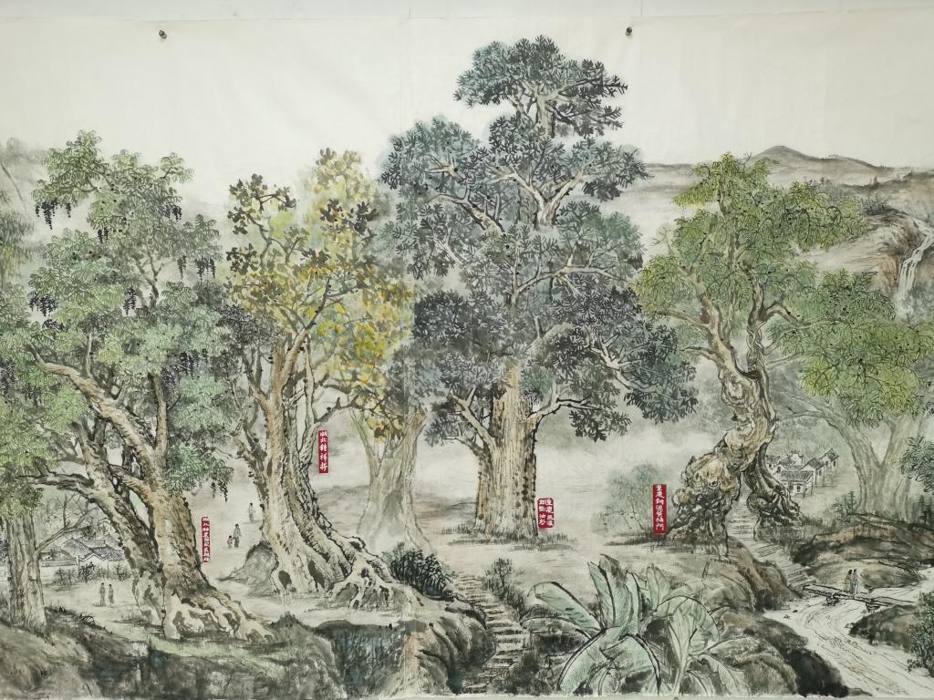目前,经过一年多的努力,《根深叶茂》经过十余次专家座谈、论证,已完成了素材收集、线描稿、小墨稿、碳稿、百棵古树及背景的落墨着色、最后汇审等工作,将在进一步完善基础上,积极筹备“七一”前后展出事宜。