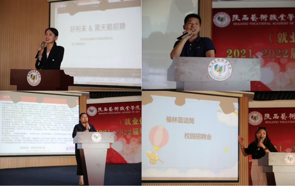 5月21日上午,陕西艺术职业学院在白鹿原校区综合楼五楼报告厅举办了2021、2022届毕业生专场招聘宣讲会暨校企合作洽谈会。西安小天鹅艺术团人事部部长马香、榆林尚德蓝话筒艺术培训中心有限公司校长王流艳、西安好利来食品有限公司西北招聘部经理李松丽、天籁艺术培训中心校长张岚兴、城市人家市场部经理李鹏飞、西安紫珊瑚装饰设计工程有限公司经理雷欣玥分别为我院毕业生进行宣讲。党委副书记、院长杨孝龙出席会议。会议由招生就业处处长尉霞主持。