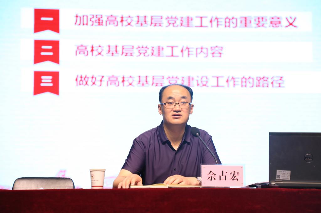 佘占宏以“新时代如何做好高校基层党建工作”为题作了专题辅导,围绕加强高校基层党建工作的重要意义、高校基层党建工作内容、做好高校基层党建设工作的路径三方面进行了深入阐述。