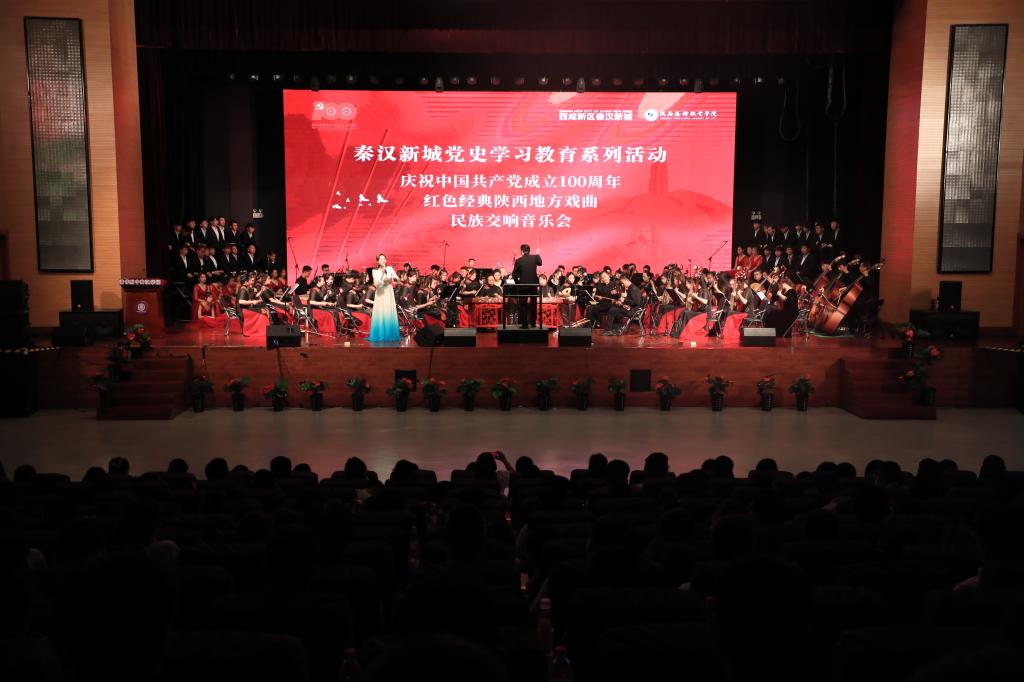 6月23日,由西咸新区秦汉新城管委会主办、陕西艺术职业学院师生担纲演出的红色经典陕西地方戏曲民族交响音乐会在秦汉中学大礼堂精彩上演,献礼建党百年。秦汉新城党委副书记吴起、院党委书记刘正利先后为音乐会致辞。院党委副书记、院长杨孝龙,秦汉新城党委委员、管委会副主任杨占成,院党委委员、副院长任玉银、邵鸣与秦汉新城管委会各单位、各部门干部员工、各街办党员、秦汉中学师生代表等一起观看了演出。