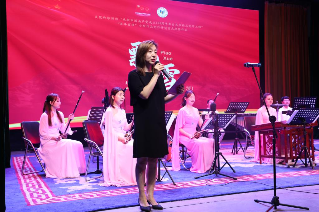 在作品演出前项目负责人、音乐系主任薛莲对项目实施情况进行总结汇报。该项目作品创作坚持以人民为中心的创作向导,力求以精品力作献礼党的百年华诞。此次竹笛与室内乐版由陕西艺术职业学院云雁民族室内乐团演奏。