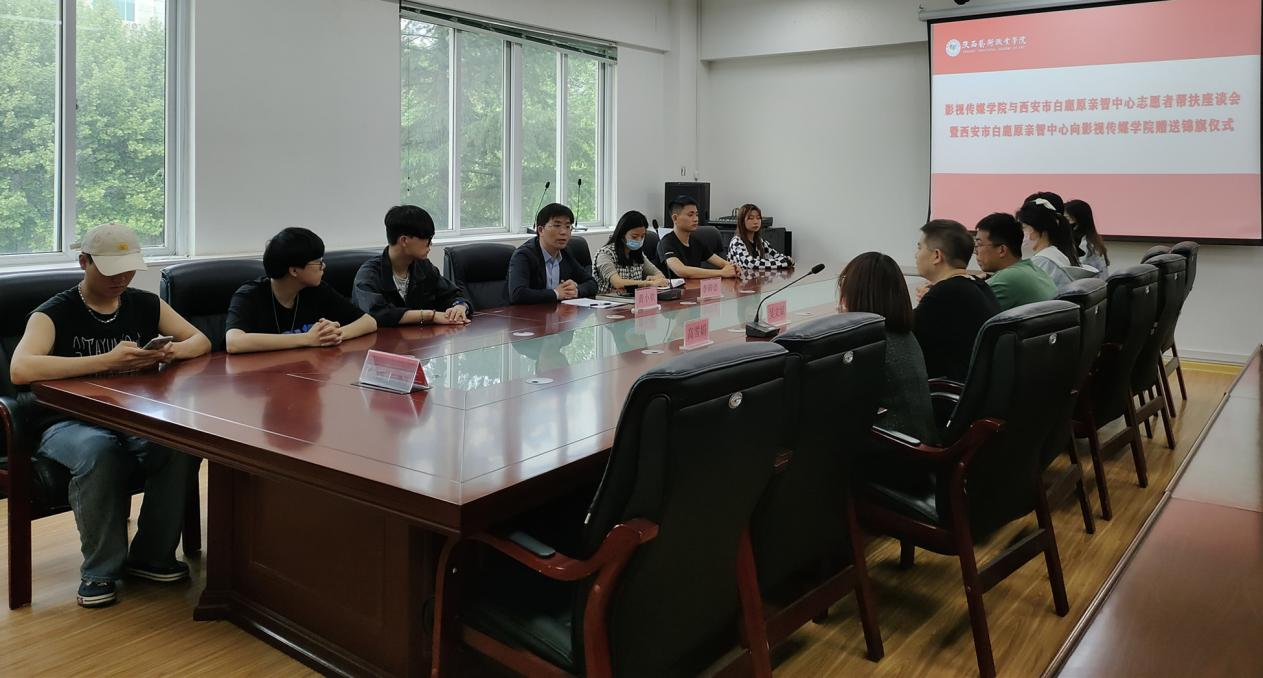 赠送仪式后,双方就志愿帮扶工作进行了座谈。座谈会上,吴文斌详细介绍了西安市白鹿原亲智中心创办过程和愿景规划并宣读了感谢信。黄小欢从发展历程、专业设置、办学成果、社会服务和志愿服务等五方面介绍了影视传媒学院基本情况。双方就持续做好志愿帮扶活动进行了深入沟通。