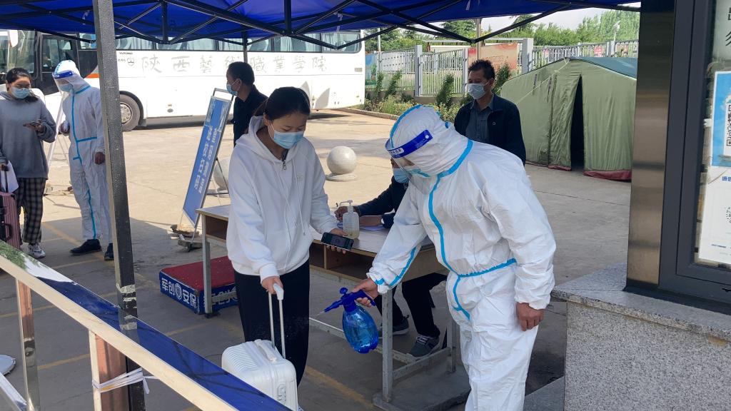 上午10时演练开始,学生佩戴口罩,自觉间隔1.5米,从大门口依次排队等待接受检验。防疫人员逐一对入校学生进行身份核验、体温检测、行程码和健康码查验、行李消杀,查验正常方可入校。入校后要求学生不要聚集扎堆,尽快前往宿舍入住。