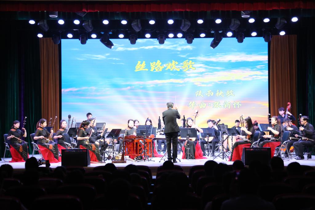 音乐会在《秦风戏韵》中拉开帷幕,板胡、二胡、琵琶、扬琴、古筝、阮、笙、竹笛等十余种民族乐器奏响宏伟壮阔、激情飞扬的乐曲,生动展现盛世中华的山河壮美,三秦儿女的幸福祥和。《丝路欢歌》、阿宫腔《秦声国风》、眉户《秦川情韵》、碗碗腔《华州新韵》、合阳线腔音乐《线戏新曲》……一首首具有浓郁陕西地方风格特色的民族乐曲,让观众充分领略陕西作为丝绸之路起点的深厚文化底蕴。驼铃阵阵,羌笛悠悠,换了音符……《河西走廊》《天山之舞》《西亚风情》在精彩的演奏中让观众穿越无垠的戈壁、茫茫的大漠、蜿蜒的山脉,沿着丝绸之路恣意昂扬,阔步前进,聆听“人类命运共同体”的强音,一步步将音乐会推向高潮。最后,由张新怀担任京胡演奏的《夜深沉》,大气典雅、荡气回肠。音乐会在经久不息的掌声中精彩落幕。