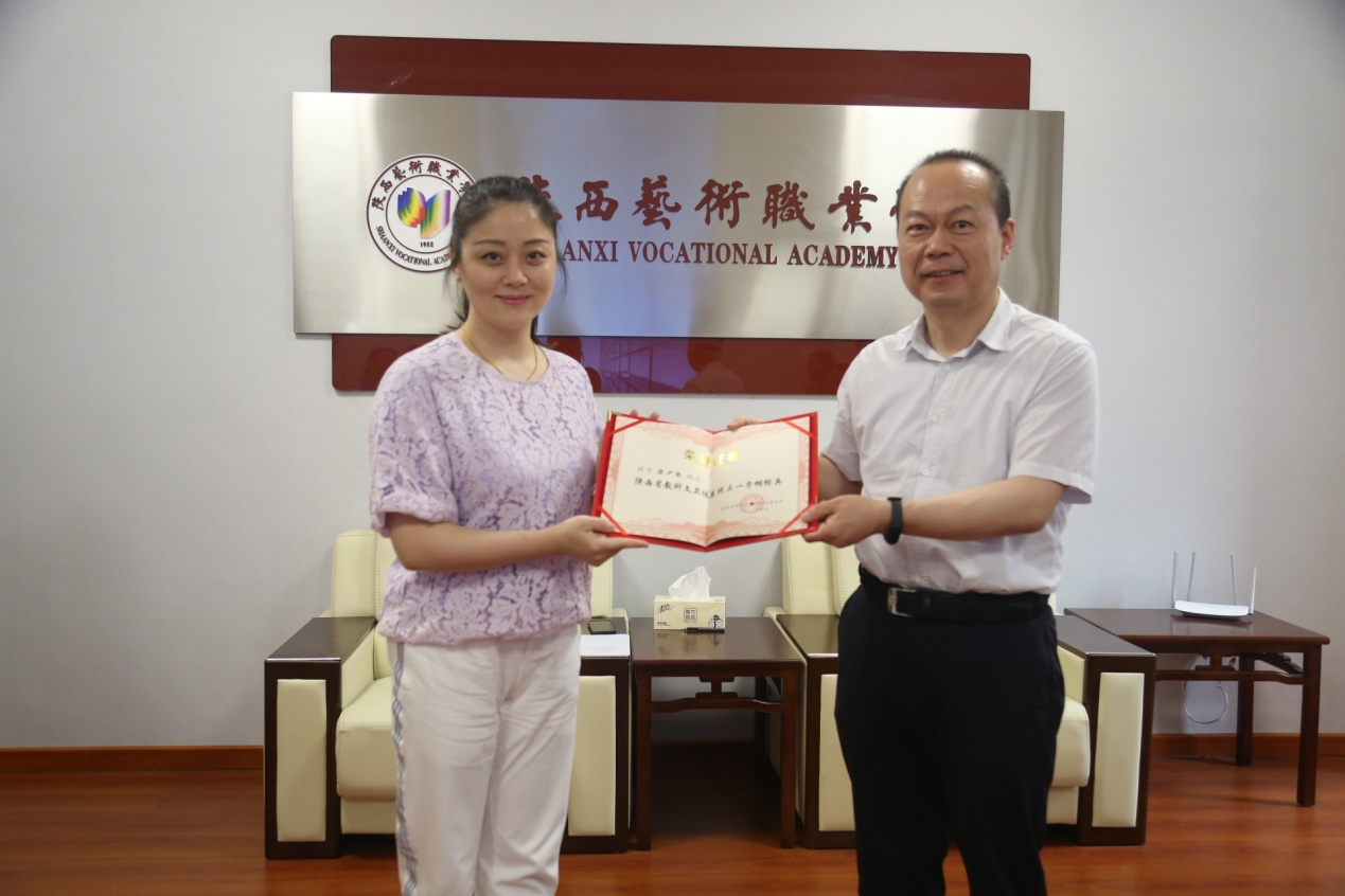 校党委书记刘正利分别为陕西省教科文卫体系统“五一巾帼标兵”称号获得者郝叶妮、梁少琴颁发荣誉证书