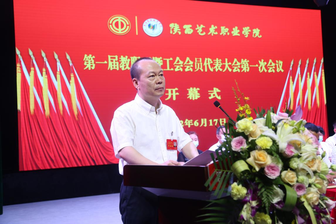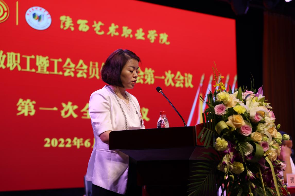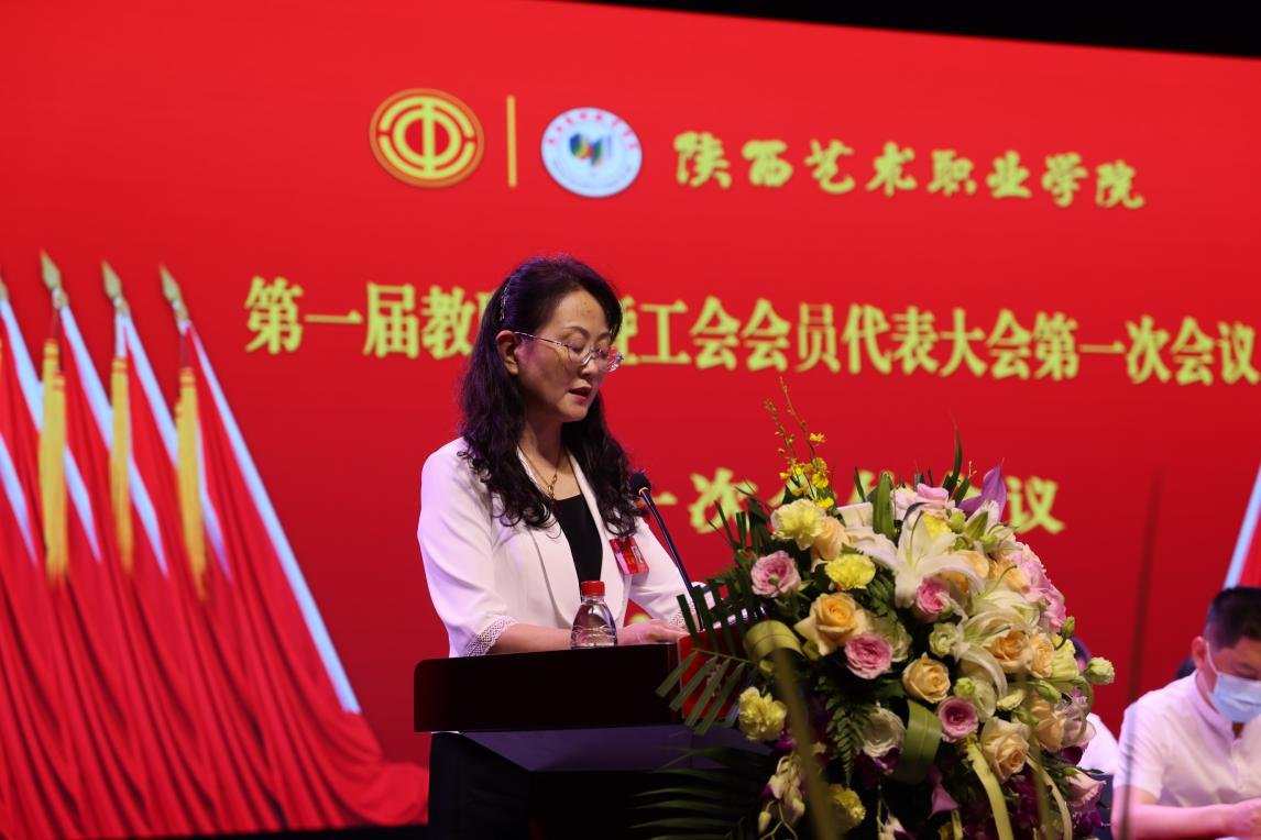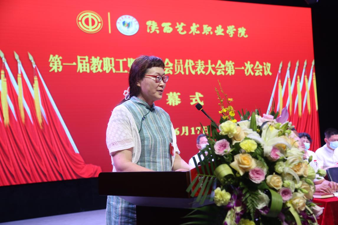 夏明文代表陕西省教科文卫体工会向大会的召开表示热烈祝贺。他表示,陕西艺术职业学院有着悠久的办学历史和优良的办学传统,学校被誉为“西北艺术人才培养的摇篮”。近年来,学校紧紧围绕服务国家战略和地方经济文化发展需求,瞄准建设“国内一流高等艺术职业院校”目标,全体教职员工团结奋进,在人才培养、科学研究、社会服务、文化传承等方面取得了令人瞩目的成就。他指出,在全面建成社会主义现代化强国的新征程上,学校工会要进一步发挥党联系教职工群众的桥梁和纽带作用,增强教职工主人翁意识,推动学校民主政治建设进程,促进学校高质量发展。一要提高政治站位,凝聚推动学校发展的强大合力。教育引导广大教职工牢固树立“四个意识”,坚定“四个自信”,做到“两个维护”,汇聚推动学校高质量发展的磅礴力量。二要切实履职尽责,维护教职工的合法权益。坚持以教职工为中心的工作导向,畅通渠道、倾听呼声,完善民主管理,开展艺术院校特色的普惠性、精准化服务,擦亮“工”字品牌。三要加强自身建设,增强做好工会工作的能力和水平。强化政治理论与工会业务知识学习,提升为教职工的服务能力和水平,成为“工会工作的行家里手”,把工会建成职工满意的“职工之家”,团结动员广大教职工,为学校教育事业共同奋斗。