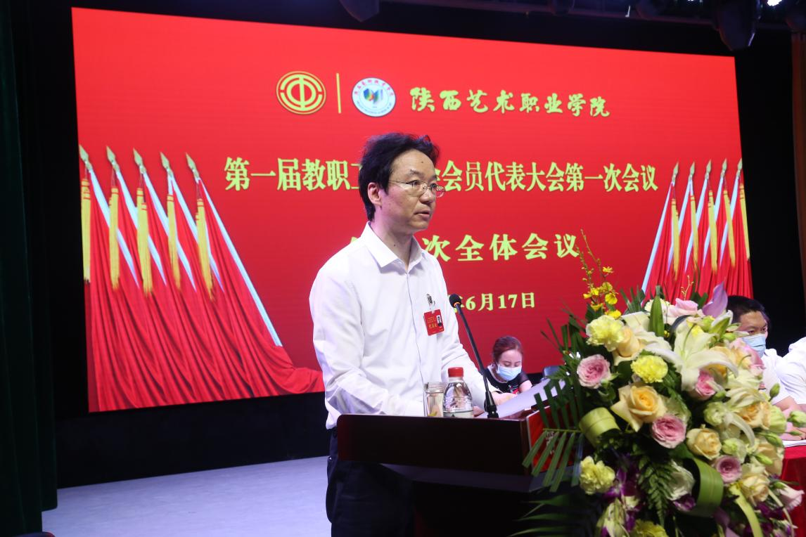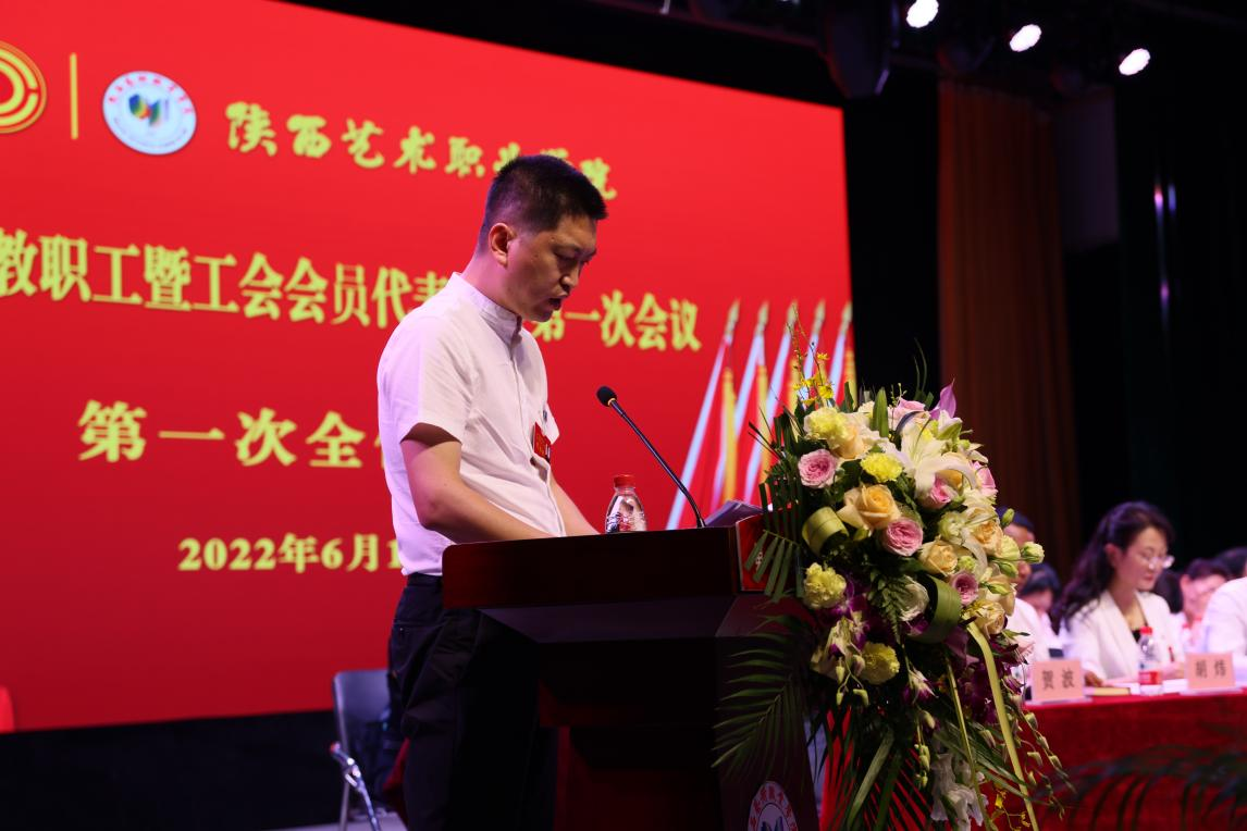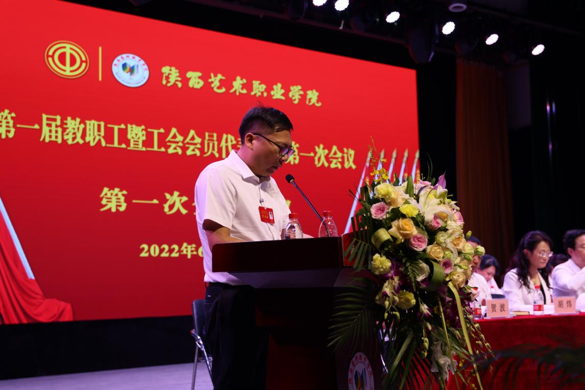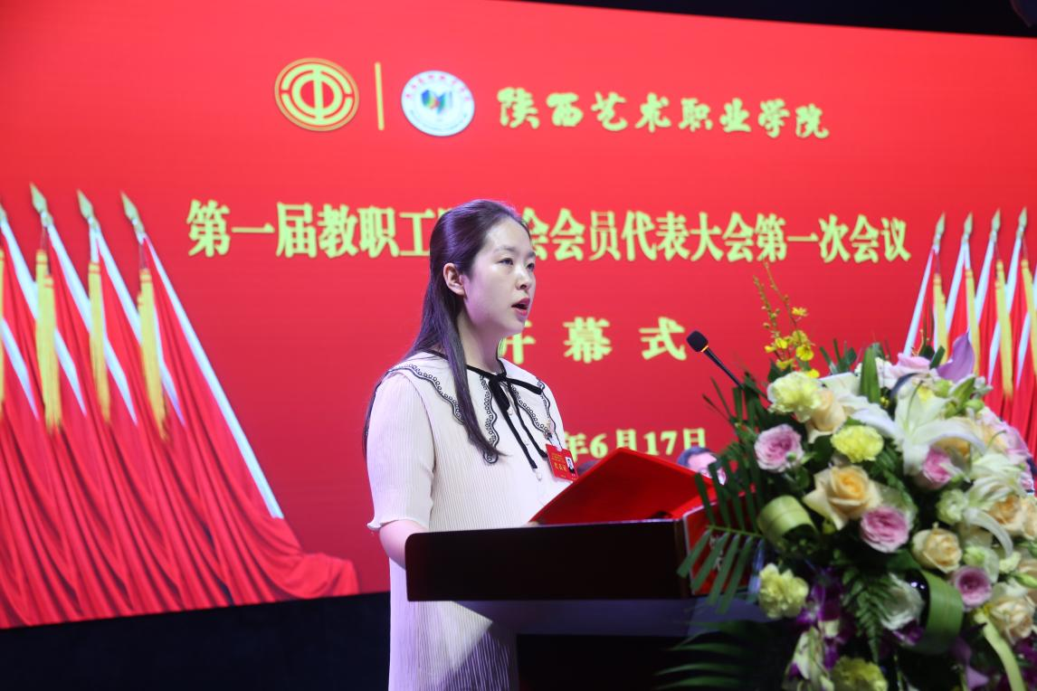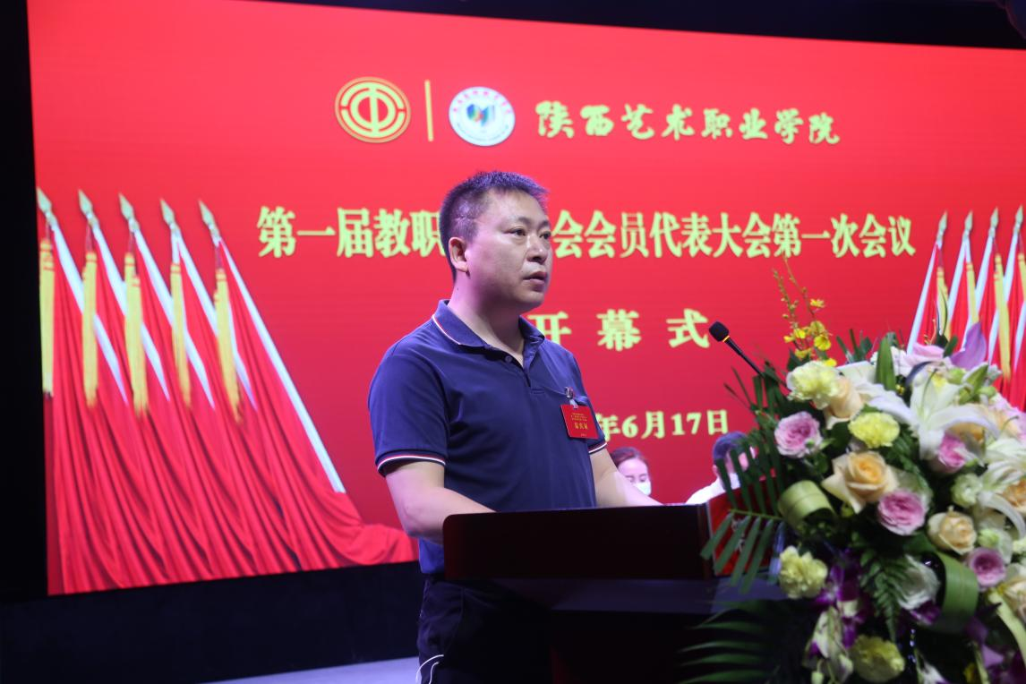 夏明文代表陕西省教科文卫体工会向大会的召开表示热烈祝贺。他表示,陕西艺术职业学院有着悠久的办学历史和优良的办学传统,学校被誉为“西北艺术人才培养的摇篮”。近年来,学校紧紧围绕服务国家战略和地方经济文化发展需求,瞄准建设“国内一流高等艺术职业院校”目标,全体教职员工团结奋进,在人才培养、科学研究、社会服务、文化传承等方面取得了令人瞩目的成就。他指出,在全面建成社会主义现代化强国的新征程上,学校工会要进一步发挥党联系教职工群众的桥梁和纽带作用,增强教职工主人翁意识,推动学校民主政治建设进程,促进学校高质量发展。一要提高政治站位,凝聚推动学校发展的强大合力。教育引导广大教职工牢固树立“四个意识”,坚定“四个自信”,做到“两个维护”,汇聚推动学校高质量发展的磅礴力量。二要切实履职尽责,维护教职工的合法权益。坚持以教职工为中心的工作导向,畅通渠道、倾听呼声,完善民主管理,开展艺术院校特色的普惠性、精准化服务,擦亮“工”字品牌。三要加强自身建设,增强做好工会工作的能力和水平。强化政治理论与工会业务知识学习,提升为教职工的服务能力和水平,成为“工会工作的行家里手”,把工会建成职工满意的“职工之家”,团结动员广大教职工,为学校教育事业共同奋斗。