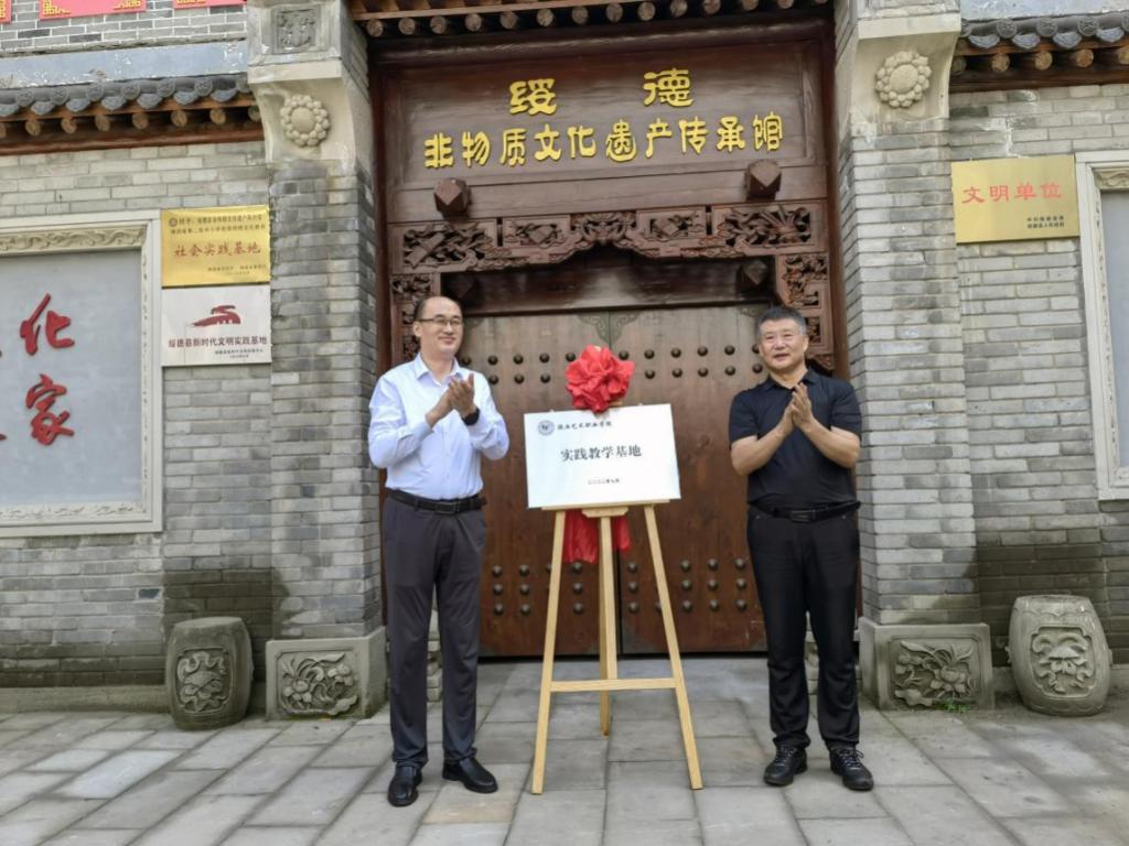 佘占宏与雒胜军共同为陕西艺术职业学院绥德县非物质文化遗产陈列馆实践教学基地揭牌。双方将统筹资源,优势互补,共同促进非遗传承发展。