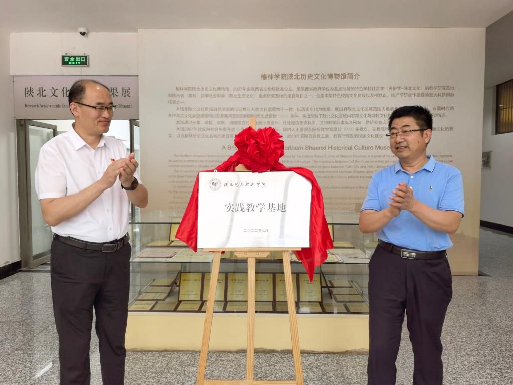 之后,在榆林学院陕北历史文化博物馆,校党委副书记佘占宏与榆林学院陕北历史文化博物馆馆长王喜明共同为陕西艺术职业学院教学实践基地揭牌。