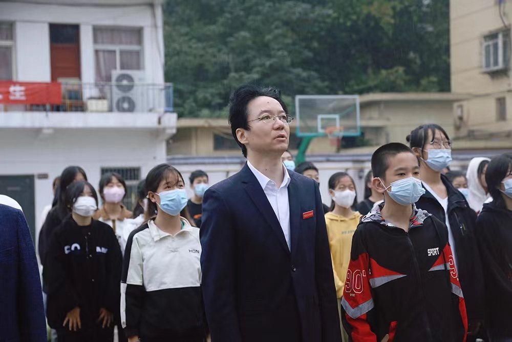 在绵绵秋雨中,升旗仪式在文艺南路校区庄严举行,伴随着《义勇军进行曲》铿锵的旋律,校领导们与师生雨中肃立,向国旗行注目礼,五星红旗冉冉升起,飘扬在校园上空。