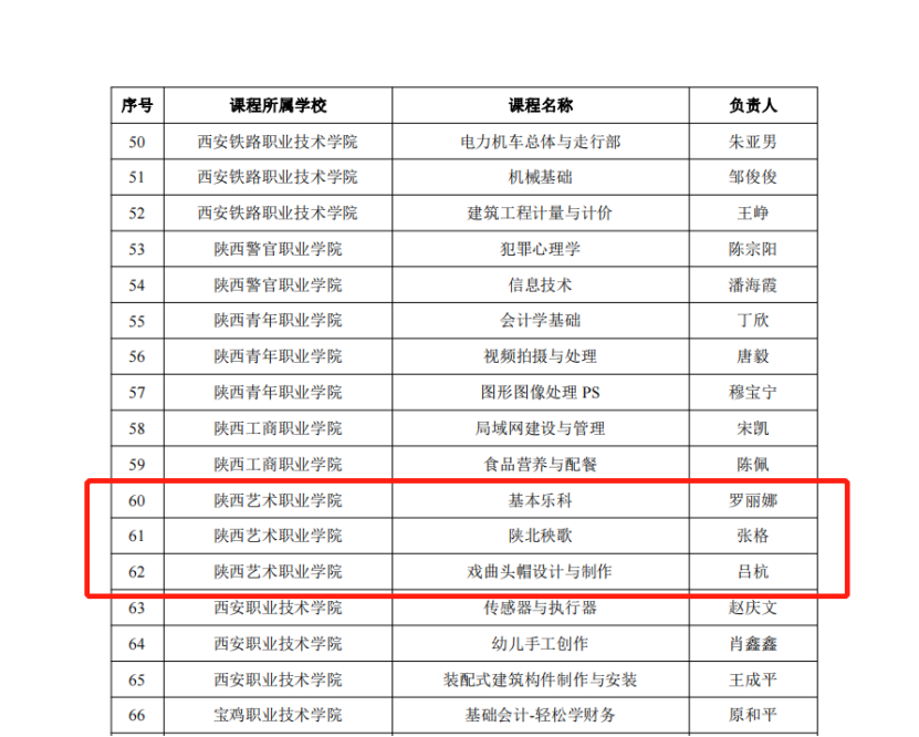 根据《陕西省教育厅办公室关于公布2022年陕西省职业教育在线精品课程认定结果的通知》(陕教职办〔2022〕47号)文件精神,我校《陕北秧歌》(张格)、《基本乐科》(罗丽娜)、《戏曲头帽设计与制作》(吕杭)三门课程经学院申报、资格审查、专家遴选、结果公示等程序,获评2022年陕西省职业教育在线精品课程。