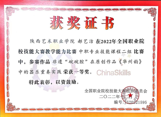 近日,2022年全国职业院校技能大赛教学能力比赛荣誉证书送达我校,由我校音乐学院胡锐、马赫苒、郝艺洁、王珂欣4位老师的参赛作品《非遗“碗碗腔”在原创作品<华州韵>中的器乐重奏实践 》喜获全国一等奖。