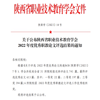 据悉,陕西省职业技术教育学会本年度共收到全省31所院校报送参评论文741篇。最终评选优秀论文613篇,其中:一等奖22篇、二等奖197篇、三等奖394篇。
