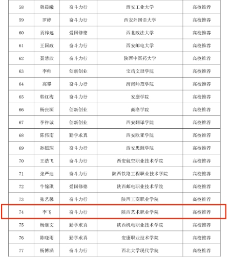 活动启动以来,我校团委组织各二级学院团总支积极宣传,大力挖掘大学生“自强”典型,并最终推荐2名同学参加省级“自强之星”的寻访评选。经团省委审核,活动共评选出“陕西省大学生自强之星”100人,我校音乐学院李飞同学获得此荣誉。
