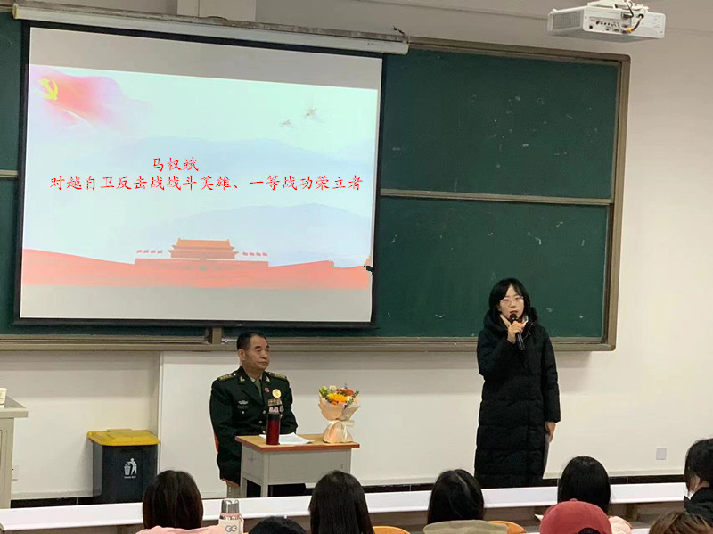 报告会伊始,黎玲结合主题教育,指出此次报告会是为了引导广大师生铭记革命历史、崇尚革命英雄、传承红色基因,厚植爱国情怀,落实习近平总书记关于“把红色基因一代代传下去”指示精神,扎实推进主题教育走深走实,特举办此次活动,随后,黎玲为在座师生介绍了此次报告会主讲人:对越自卫反击战战斗英雄、一等战功荣立者马权斌大校的个人简介。
