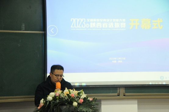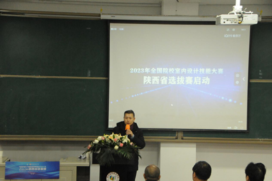 陕西省室内装饰协会会长李庭辉代表主办方发言。他强调此次技能大赛的重要意义,希望各位参赛队员能够轻装上阵,赛出风格,赛出水平,赛出风采,通过大赛选拔出优秀的室内设计专业团队和个人,促进室内设计专业建设和发展。