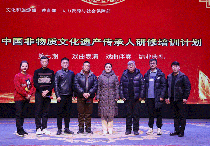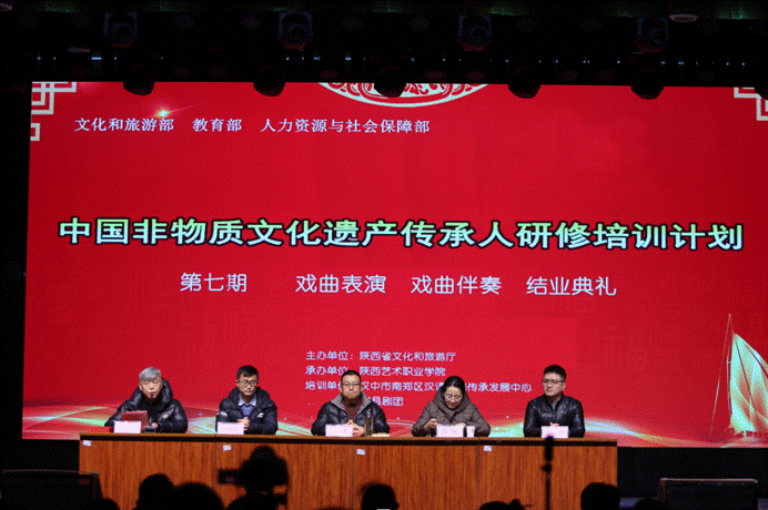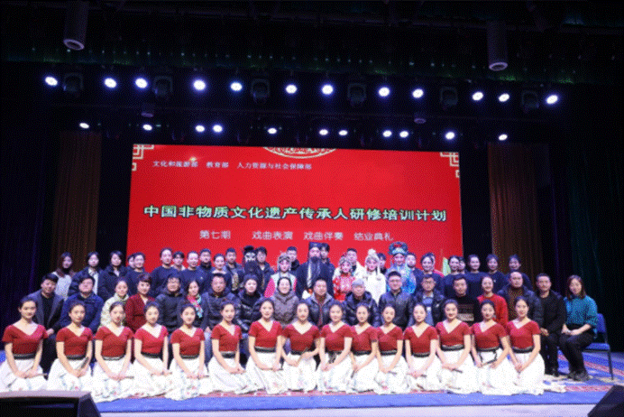 1月9日上午,由文化和旅游部、教育部、人力资源社会保障部共同实施,陕西省文化和旅游厅与陕西艺术职业学院联合举办的2023年度中国非遗传承人群研修培训计划第七期培训班结业典礼暨汇报演出在文艺南路校区小剧场隆重举行。陕西省文化和旅游厅非物质文化遗产处副处长周颖,我校戏曲学院院长李小雄,副院长张文宏、张冬,综合办公室主任刘治国出席结业典礼,并与来自汉中市洋县剧团、汉中市洋县剧团、南郑区汉调桄桄传承发展中心的50位学员以及学院部分师生一同观看了汇报演出。结业典礼仪式由张文宏主持。