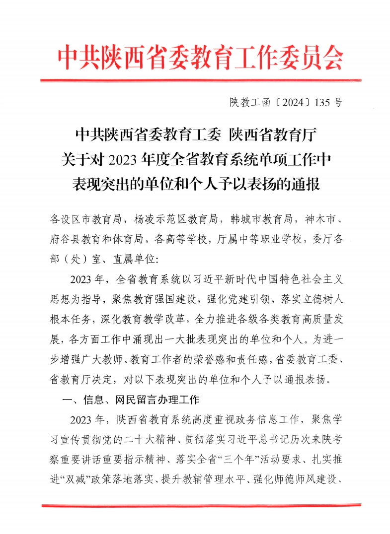 近日,据《中共陕西省委教育工委 陕西省教育厅关于2023年度全省教育系统单项工作中表现突出的单位和个人予以表扬的通报》(陕教工函〔2024〕135号)文件公布,对高校12个单项工作表现突出的单位和个人予以通报表扬。陕西艺术职业学院集体、个人荣获多项肯定。