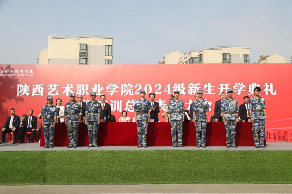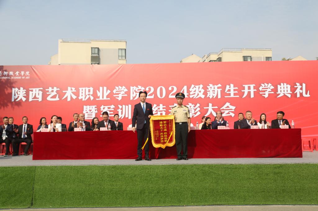 马琳了宣读陕西艺术职业学院关于2024级学生军训优秀连队、优秀学员的表彰决定。杨孝龙代表学校为承训基地赠送锦旗。郑毅刚、任玉银、邵鸣分别为优秀连队、优秀学员颁奖。全体校领导为2024级新生代表佩戴校徽。