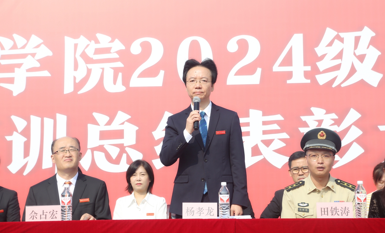 党委副书记、校长杨孝龙,承训部队副大队长田铁涛中校,校党委副书记佘占宏,党委副书记、纪委书记郑毅刚,党委委员、副校长任玉银、邵鸣、马琳,党委委员、组织部部长许仲举、学工部部长梁晓婷; 各二级学院党总支书记、院长,各处室负责人以及2024级全体学生、教官、辅导员、班主任等参加大会。 大会由佘占宏主持。