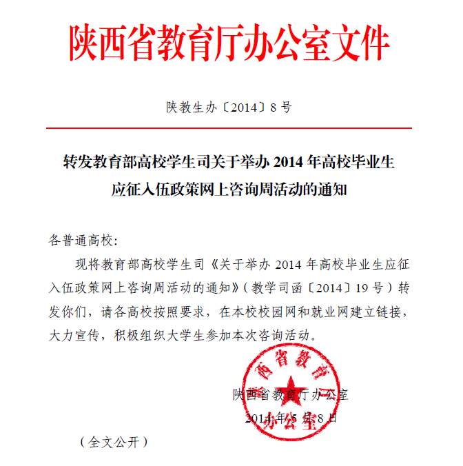 陕西省教育厅关于转发教育部高校学生司关于举办2014年高校毕业生应征入伍政策网上咨询周活动的通知