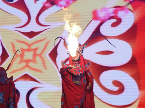 晚会现场,来自陕西教育文化系统的工作者、陕西相关学校师生同台献艺、精彩纷呈,其中学院毕业生寇麟独具陕西地方特色的演唱,收获阵阵掌声;在校学生侯曜峰、王秦辉、姜宇杰三位同学联袂表演的川剧变脸,默契的配合、精湛的喷火表演令观众震撼,将晚会推向高潮。