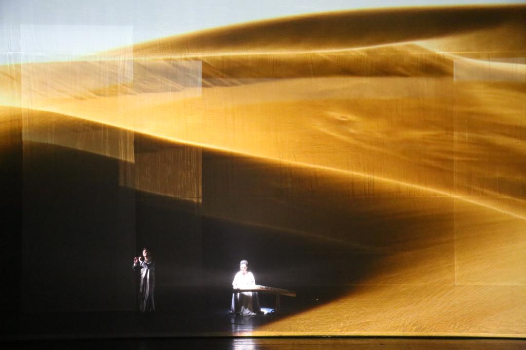 《丝路筝途》以盛唐时期丝绸之路为背景,以筝乐为主要表现载体,融合传统民族器乐、电子音乐、戏剧、舞蹈、诗歌与多媒体创新技术等,以故事性叙事手法,展现大唐使节出行西域历经的艰途与筑梦之路。全篇分启程、艰途、绿洲、战争、异域、遥思、忆梦七幕。