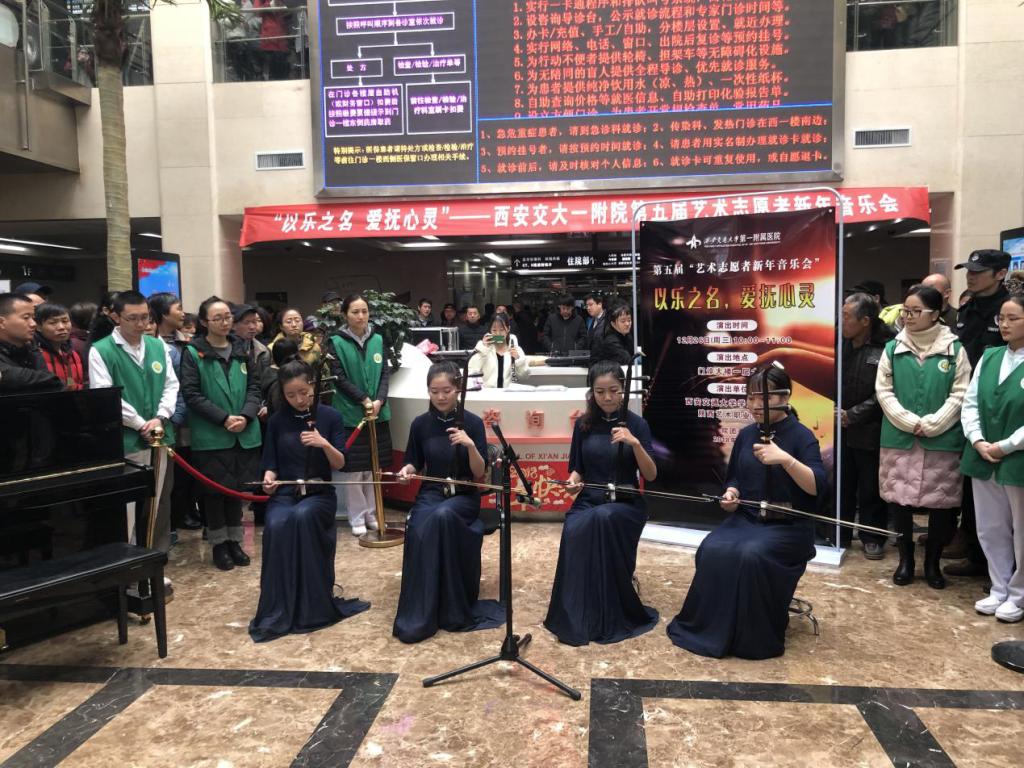 上午10时许,名为“以乐之名•爱抚心灵”西安交大一附院第五届志愿者新年音乐会在交大一附院门诊一层大厅正式拉开帷幕。此次演出,由我院志愿者以及西安交通大学学生艺术团学生共同完成。为了向听众献上不同风格和表现形式的优美音乐,演员们准备了丰富多彩的节目,不仅有萨克斯、单簧管、钢琴等乐器演奏的西方经典音乐,更有民族气息浓郁的中阮重奏《天地之间》、二胡齐奏《赛马》等中华名曲。美好的旋律、温暖的关怀,使许多行色匆匆穿梭于门诊大厅的就医者被琴声所吸引,放慢了脚步,纷纷聚拢过来,感受音乐带来的心灵抚慰。