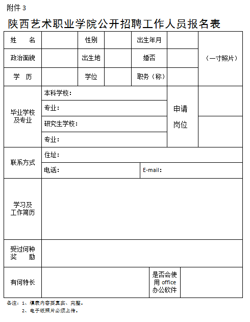 2.报名方式:应聘者将报名表、个人简历、本科、研究生学历学位证书(应届生须提供学生证或学籍证明)、获奖证书等材料(扫描件),报考有中共党员要求的岗位还需提供党员证明,同时发送至陕西艺术职业学院干部人事处邮箱,每人限报1个工作岗位。非一次报齐材料者将不予接收,亦不可多次发送。报名邮箱:syzrsczp@163.com。