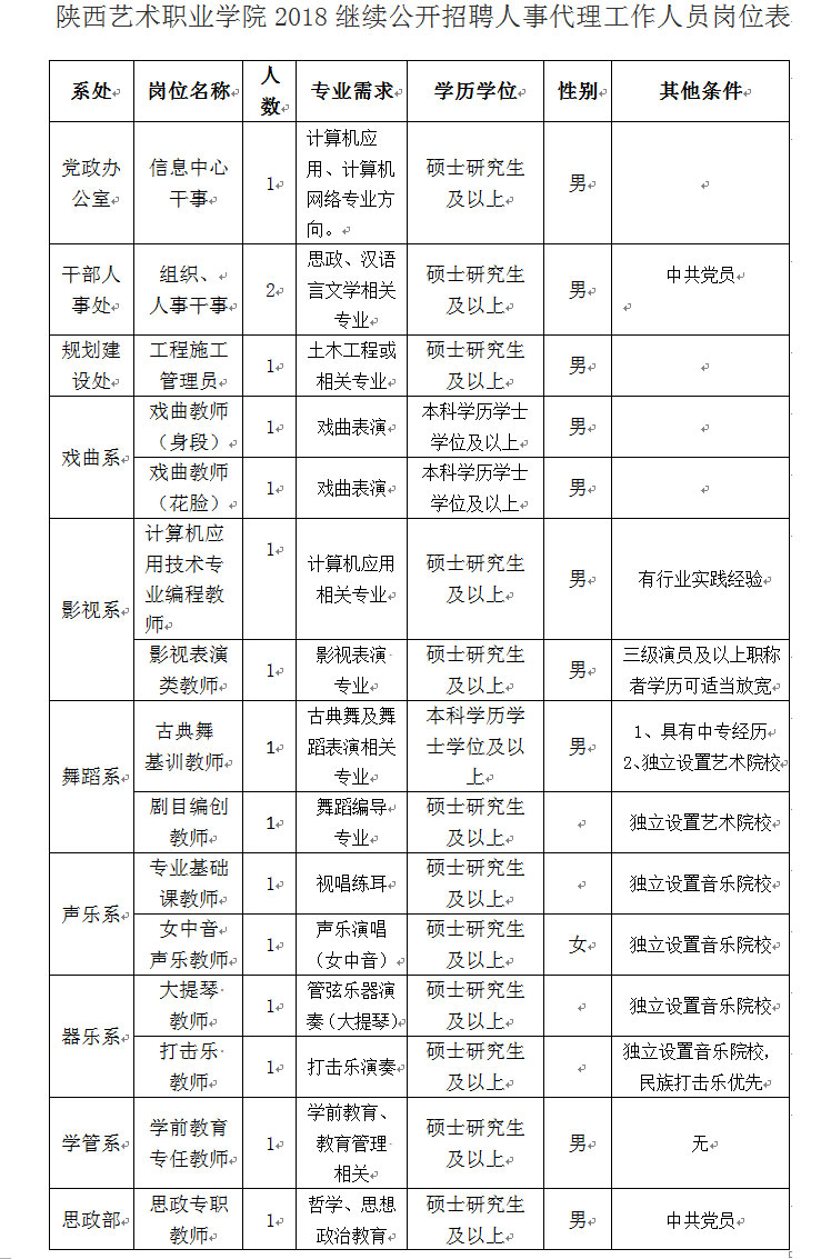 2、《陕西艺术职业学院2018年继续公开招聘人事代理工作人员计划表》