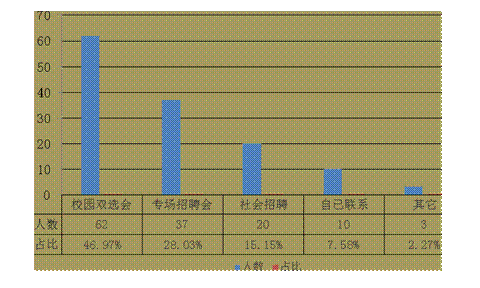 通过对132位高职(专科)毕业生就业渠道调查,46.97%的毕业生是通过校园双选会、28.03%的毕业生是通过专场招聘会找到工作的.可见校园双选会和专场招聘会是我院毕业生就业信息获取的主渠道。其他就业信息获取渠道如下图。