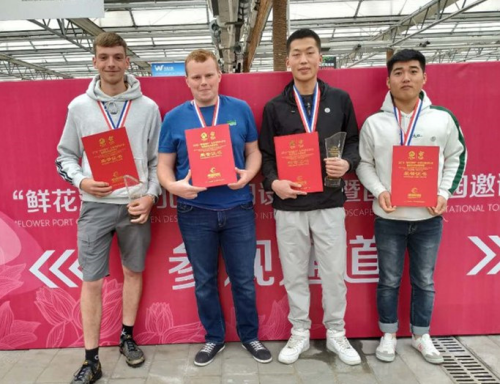 | 美术系环境艺术设计专业学生邓泽南(右二)、田希琛(右一)荣获大赛最佳砌筑奖 |