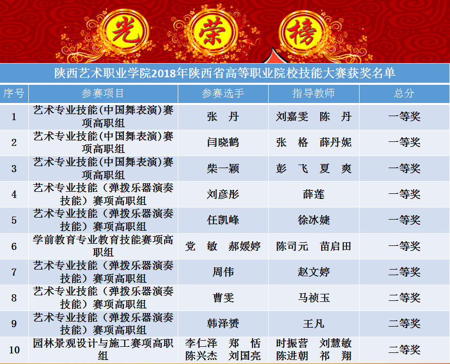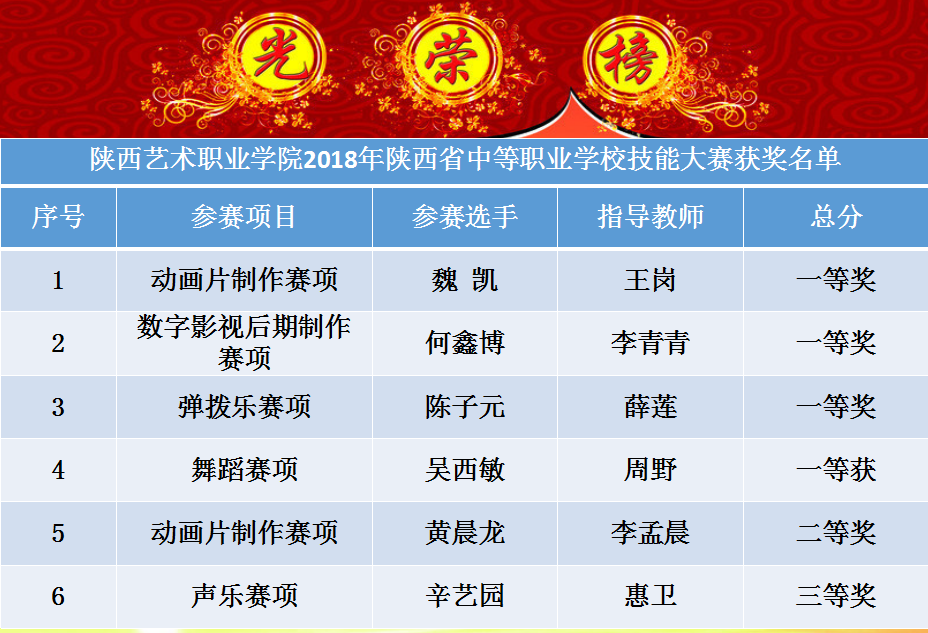陕西艺术职业学院2018年陕西省中等职业学校技能大赛获奖名单