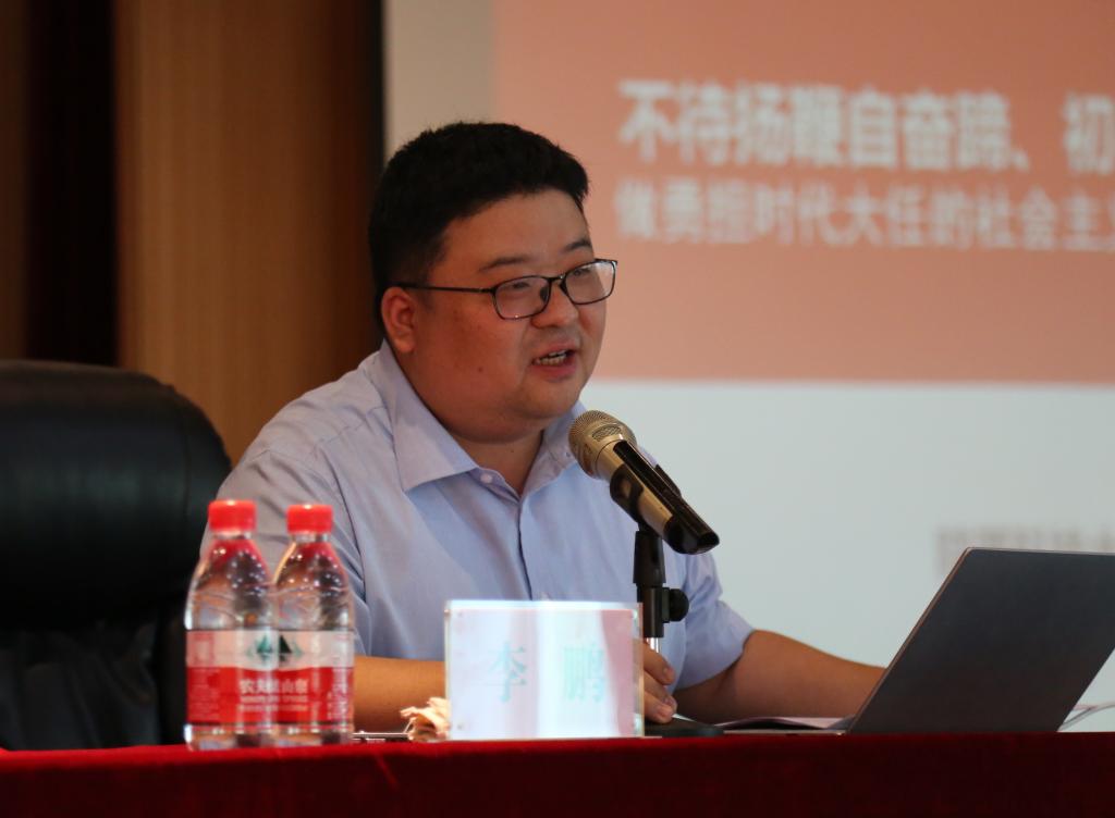 李鹏授课的题目为《不待扬鞭自奋蹄,初心不忘正当年——做勇担时代大任的社会主义建设者和接班人》,他以时间这一哲学主题为切入点,紧贴青年学生实际、利用自身丰富的大学生思想政治教育工作经验、鲜活的事例、生动的语言,围绕高等教育要培养什么样的人?怎样培养人?对习近平总书记在北京大学师生座谈会讲话进行了深入浅出的解读。他指出,面对新时代,青年学子要牢记习近平总书记“爱国、励志、求真、力行”的要求,要有时不我待,只争朝夕的紧迫感,做实干家,做奋斗者,做勇担时代大任的社会主义建设者和接班人。
