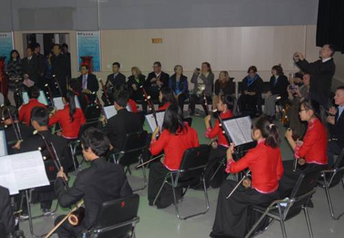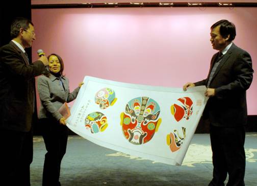 观摩结束后,访华团一行共同观看欣赏了我院安排的大型文艺演出和民乐乐团演奏会。刘胜辉院长在欢迎仪式致辞中简要介绍了陕西艺术职业学院的办学情况、学生规模及专业设置,并向访华团代表赠送了由该院美术教师创作的秦腔脸谱绘画艺术作品,希望有更多的外国朋友知道秦腔,了解中国文化,喜欢中国艺术。