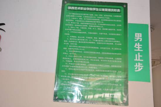 明确公寓管理员职责,制定完善《陕西艺术职业学院公寓管理员职责》与《陕西艺术职业学院公寓管理办法》,约束管理员行为,提高公寓管理员行动的自觉性与科学性,并将规章制度上墙,做到入耳入心,更进一步做好学生公寓管理工作。
